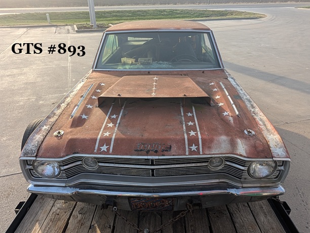 - LP23H72329***: GTS#472: OWNERSHIP UPDATE Eric from www.musclemopars.com in Wisconsin now owns the completed 1967 GTS as of March, 2018. Here is the original listing: Paul lives in south Florida and just bought this 1967 383 GTS. Formerly from Massachusetts, this GTS is a project car that the former owner was going to scrap before Paul came along in the nick of time. The fender tag is pitted, but Paul can see this GTS was RR1 Yellow with a white vinyl top. The drivetrain is intact, and this GTS also had a console tach and front disc brakes.